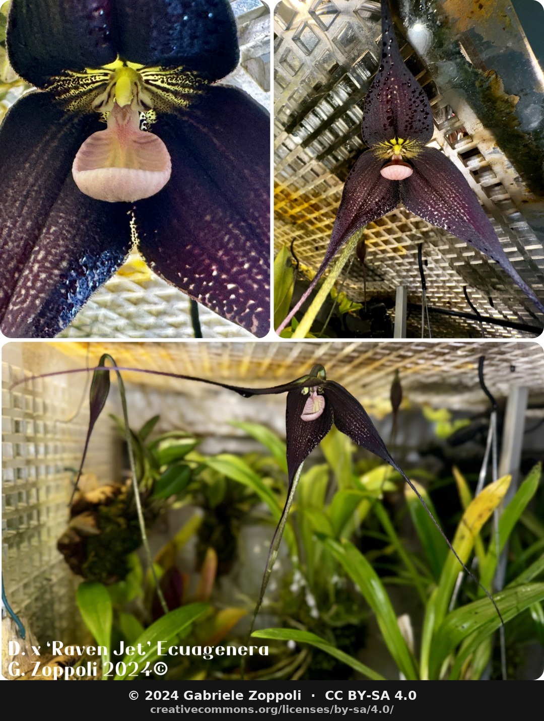 - D. Raven ‘Jet’ — a hybrid of D. vampira × D. roezlii. Flowers very dark, almost black, with the white callus glands of vampira reduced.