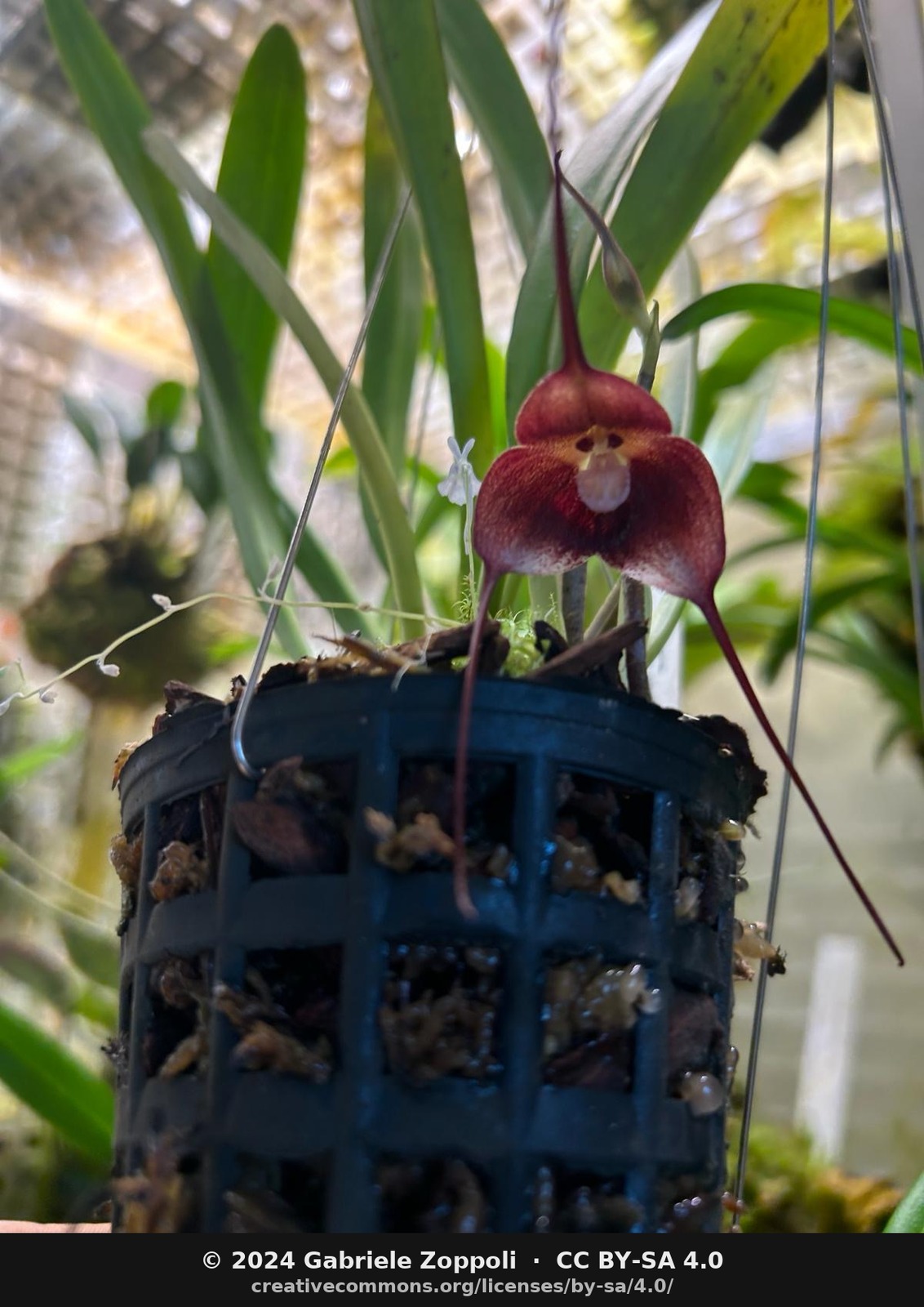 - D. simia — “mounted when available”. Flowers are produced singly on pendulous inflorescences that reach downwards out of the sphagnum mat; the photographs on this site catch the flower as it drops through the mount, which is how the plant wants to present it.