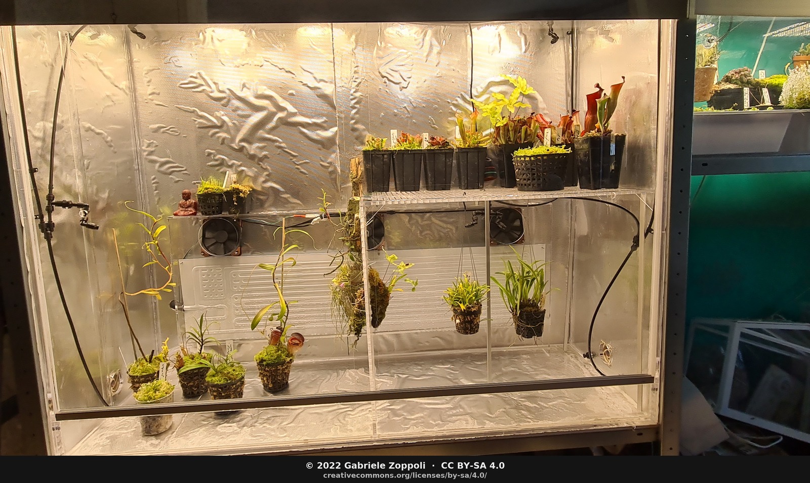January 2023. Eight months in. The upper shelf has filled, a pair of hanging Nepenthes, moss starting to establish in the lower trays.