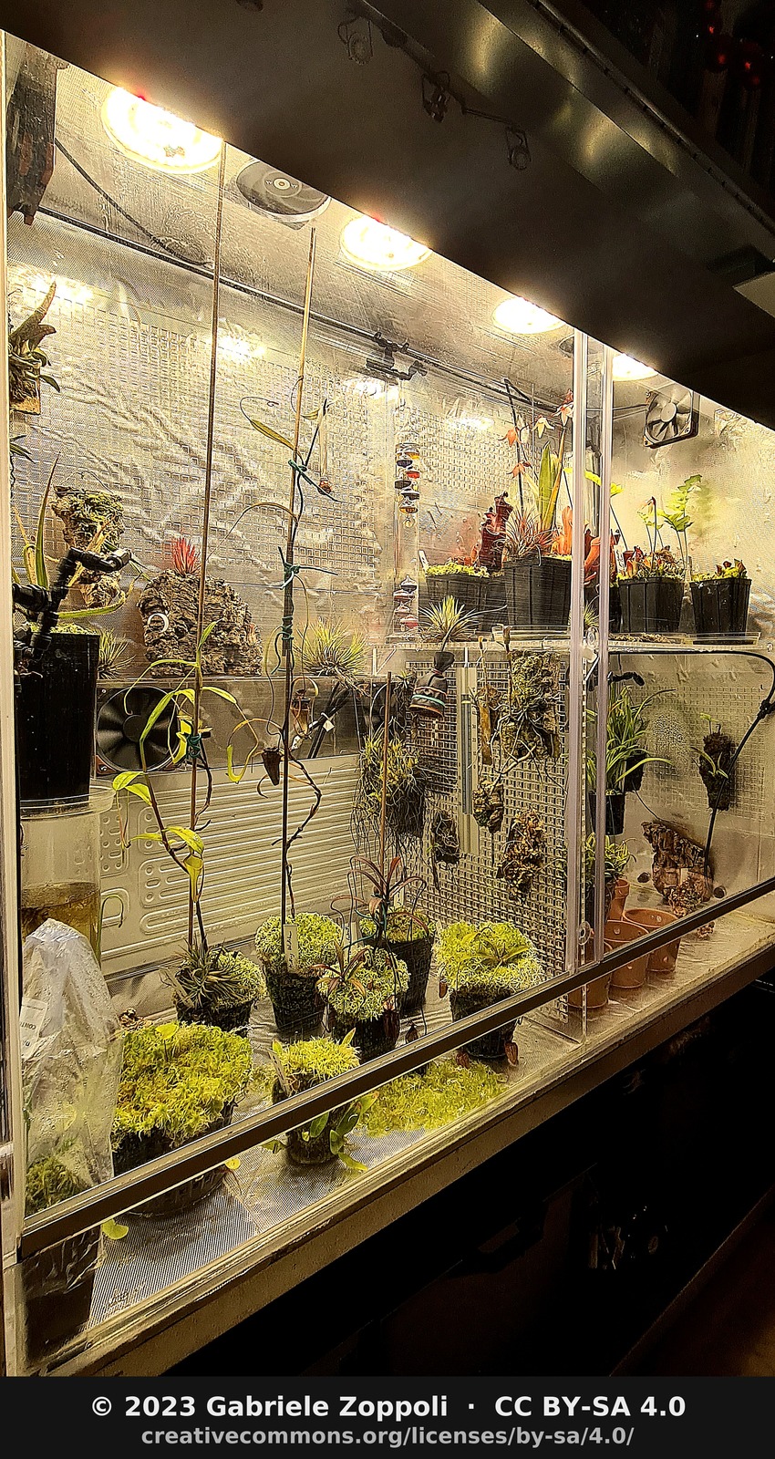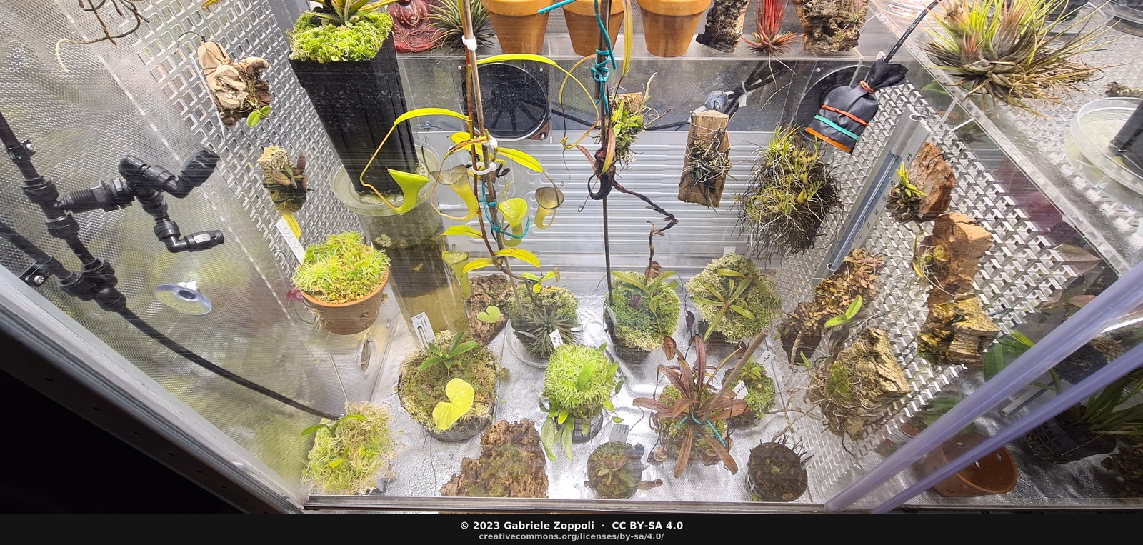 April 2023. Top-down shot of the lower shelf — pump-and-plumbing visible on the left, mist nozzle at centre-top, epiphytes scattered across the grid.