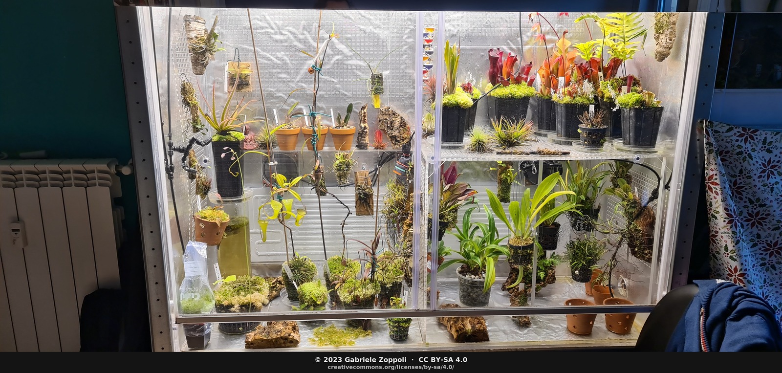 March 2023. The first Heliamphora pitchers starting to catch the light — upper-right shelf. The radiator is visible on the left (room at ~22 °C during the night cycle).