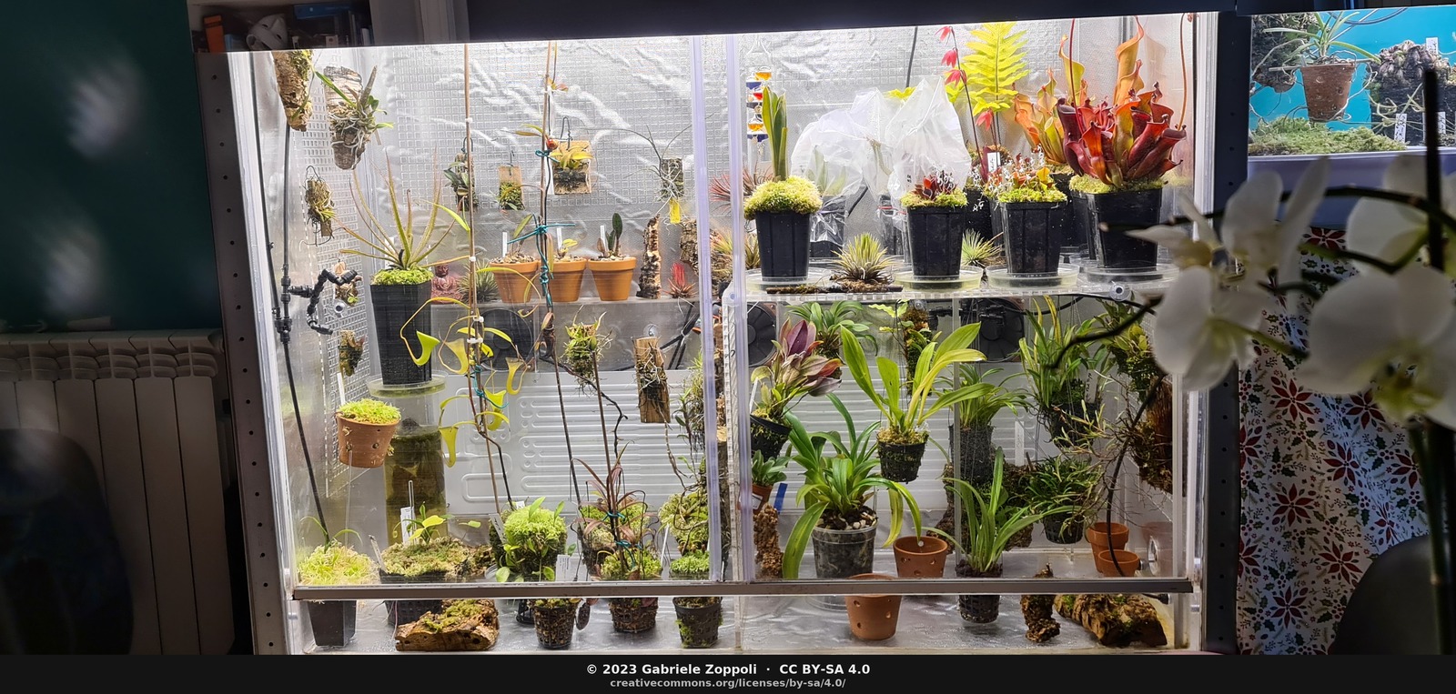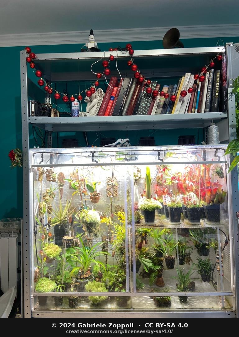 April 2023. Phalaenopsis in bloom on the right (outside the cabinet) for scale.