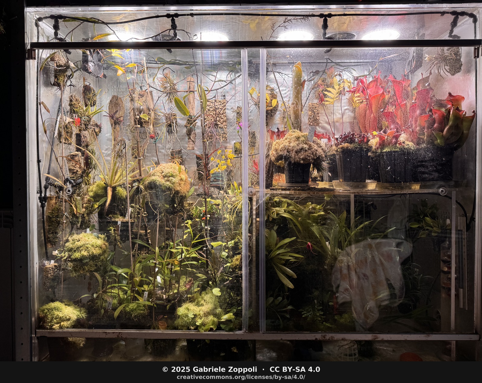February 2025. Night view, room lights off. The two shelves are now full top-to-bottom; mosses have migrated onto the inside of the glass; the Heliamphora on the right have pitcher stems pushing through the neighbours. Thirty-three months in.